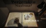 Petugas memperlihatkan arsip tokoh organisasi pergerakan nasional yang dipamerkan di Museum Sumpah Pemuda, Jakarta, Selasa (22/3/2022). Museum Sumpah Pemuda kembali dibuka pasca revitalisasi dengan menampilkan sejumlah perubahan dalam format penyajian informasi lebih interaktif ke dalam bentuk teknologi digital untuk menarik perhatian pengunjung khususnya kaum milenial. (FOTO : Republika/Putra M. Akbar)