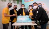 (dari Kiri) Business Development & Promotion Senior Manager PT. Indomarco Prismatama Alvin Widjaja, Direktur Merchandising PT. Indomarco Prismatama Rudy Budiarto, Coordinator Director PT Indomarco Prismatama Wiwiek Yusuf, SEVP Micro & Consumer Finance Bank Mandiri Josephus K Triprakoso dan SVP Transaction Banking Retail Sales Bank Mandiri Thomas Wahyudi saat penandatangan kerjasama pemanfaatan QRIS Livin by Mandiri di Jakarta, Selasa (22/3/2022). Dalam kerjasama ini, Bank Mandiri mengembangan akses pembayaran dengan scan kode QRIS di Super App Livin by Mandiri berlogo kuning untuk memudahkan pembayaran di Indomaret dan mempopulerkan transaksi nontunai di masyarakat. Berlangsung hingga 30 April 2022, Pembayaran dengan QRIS Livin by Mandiri akan mendapatkan cashback 20% di seluruh gerai Indomaret dan diskon 50% di Point Coffee. Pada Maret ini telah berjalan Promo Tebus Murah Coca Cola/ Fanta/ Sprite 1.5 liter seharga Rp 5000 dengan minimal belanja Rp 50.000, dan Promo Diskon 50% di Drive Thru Indomaret khusus untuk pembelian makan siap saji (tidak berlaku untuk pembelian minuman). (FOTO : Prayogi/Republika.)