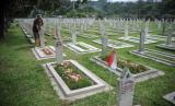 Petugas memasang bendera merah putih di makam pahlawan yang berjuang pada peristiwa Bandung Lautan Api di Taman Makam Pahlawan Nasional, Cikutra, Bandung, Jawa Barat, Rabu (23/3/2022). Setiap tanggal 23 Maret warga Kota Bandung memperingati peristiwa Bandung Lautan Api yang terjadi pada tahun 1946 sebagai peristiwa yang bersejarah. (FOTO : ANTARA/Raisan Al Farisi)