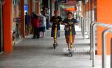 Wisatawan bermain skuter listrik di teras pertokoan Malioboro, Yogyakarta, Rabu (23/3/2022). Gubernur DIY Sri Sultan HB X menegaskan becak motor atau bentor dan skuter listrik tak boleh beroperasi di kawasan Malioboro Jogja. Menurut Sultan, kendaraan yang boleh beroperasi di Malioboro adalah becak kayuh dan andong sebagai angkutan tradisional yang sudah diatur di Perda DIY. DIY sudah memiliki Perda No.5/2016 tentang Moda Transportasi Tradisional Becak dan Andong. Sultan meminta Pemkot Jogja segera membereskan skuter listrik dan bentor yang masih berada di kawasan Malioboro. (FOTO : Wihdan Hidayat / Republika)