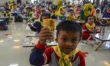 REPUBLIKA.CO.ID,CIAMIS -- Siswa PAUD menunjukkan makanan olahan ikan pada acara gerakan cinta rupiah dan makan ikan massal di Gedung Kesenian, Kabupaten Ciamis, Jawa Barat, Kamis (24/3/2022).