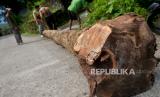 Pekerja memindahkan kayu Sonokeling ke atas truk di Imogiri, Bantul, Yogyakarta, Kamis (24/3/2022). Mereka khusus mencari kayu Sonokeling diberbagai wilayah Yogyakarta. Kayu Sonokeling ini selanjutnya dibawa ke Surabaya untuk diproses sebelum diekspor. Harga kayu sonokeling cukup tinggi, untuk kayu yang bagus bisa mencapai ratusan juta. (FOTO : Wihdan Hidayat / Republika)