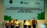 Gubernur Jawa Barat Ridwan Kamil (kedua kiri) bersama Wakil Bupati Bogor Iwan Setiawan (kiri), Rektor IPB University Arif Satria (kanan), dan Direktur Komersial dan UMKM Bank BJB Nancy Adistyasari (kedua kanan) menyerahkan penyaluran Kredit Usaha Rakyat (KUR) dan penyerahan ID Card atau ATM Co-Branding Bank BJB kepada petani milenial Provinsi Jawa Barat di Auditorium Fakultas Ekonomi dan Manajemen IPB University, Dramaga, Kabupaten Bogor, Jawa Barat, Kamis (24/3/2022). Pemerintah Provinsi Jawa Barat menggelar inaugurasi atau wisuda 1.249 peserta Program Petani Milenial dengan target regenerasi petani dan isu ketahanan pangan dapat terpecahkan pada tahun 2045. (FOTO : Antara/Arif Firmansyah)