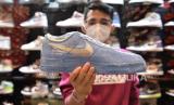 Salah satu peserta Jakarta Sneaker Day (JSD) menunjukkan koleksi sneakers Nike Air Force 1 Low x Off-White yang dijual dengan harga Rp 40 juta di Senayan City Mall, Jakarta, Kamis (24/3/2022). Acara JSD 2022 menampilkan beragam koleksi sneakers dari brand lokal dan mancanegara. Pameran tersebut berlangsung dari 24 Maret sampai 27 Maret 2022. (FOTO : Republika/Edwin Putranto)