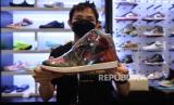 Salah satu peserta Jakarta Sneaker Day (JSD) menunjukkan koleksi sneakers Nike Air Jordan 1 Low Travis Scott yang dijual dengan harga Rp 30 juta di Senayan City Mall, Jakarta, Kamis (24/3/2022). Acara JSD 2022 menampilkan beragam koleksi sneakers dari brand lokal dan mancanegara. Pameran tersebut berlangsung dari 24 Maret sampai 27 Maret 2022. (FOTO : Republika/Edwin Putranto)