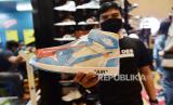 Salah satu peserta Jakarta Sneaker Day (JSD) menunjukkan koleksi sneakers Nike Air Jordan 1 Retro High OG Bred yang dijual dengan harga Rp 20 juta di Senayan City Mall, Jakarta, Kamis (24/3/2022). Acara JSD 2022 menampilkan beragam koleksi sneakers dari brand lokal dan mancanegara. Pameran tersebut berlangsung dari 24 Maret sampai 27 Maret 2022. (FOTO : Republika/Edwin Putranto)