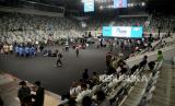 Pengunjung berada di area yang seharusnya menjadi lokasi area kajian dalam acara Muslim Life Fair 2022 di Istora Senayan, Jakarta, Sabtu (26/3/2022). Pihak penyelenggara mengungkapkan walau kajian para penceramah dibatalkan namun acara Muslim Life Fair 2022 tetap belangsung dan animo masyarakat tinggi (FOTO : Prayogi/Republika.)