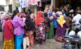 Sejumlah warga antre membeli minyak goreng curah di sebuah toko sembako di kompleks pasar Bandongan, Magelang, Jawa Tengah, Sabtu (26/3/2022). Tingginya harga minyak goreng kemasan membuat warga rela antre lama dan berdesak-desakan untuk membeli minyak goreng curah yang dijual seharga Rp15 ribu per kilogram, dan setiap warga dibatasi hanya boleh membeli dua kilogram. (FOTO : ANTARA/Anis Efizudin)