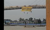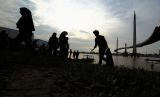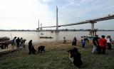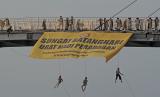 REPUBLIKA.CO.ID,JAMBI -- Anggota organisasi dan komunitas pecinta alam membentangkan spanduk kritik sambil disaksikan warga di Jembatan Gentala Arasy di atas Sungai Batanghari, Jambi, Sabtu (26/3/2022).