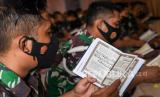Seorang prajurit TNI AL membaca surat Al-Fatihah saat melakukan doa bersama di Mako Komando Lintas Laut Militer (Kolinlamil), di Jakarta, Senin (28/3/2022). Doa bersama tersebut dilakukan untuk mendoakan dua prajurit Korps Marinir TNI AL yakni Lettu Marinir (Anumerta) Muhammad Ikbal dan Praka Marinir (Anumerta) Wilson Anderson Here yang gugur dalam serangan kelompok separatis teroris (KST) di Distrik Kenyam, Kabupaten Nduga, Papua pada Sabtu (26/3/2022). (FOTO : Antara/M Risyal Hidayat)