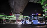 REPUBLIKA.CO.ID,JAKARTA -- Bus Transjakarta melintas di bawah halte integrasi CSW di Jakarta, Senin (28/3/2022).