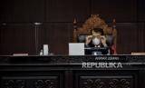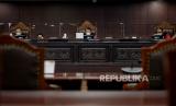 Suasana sidang putusan di Gedung MK, Jakarta, Selasa (29/3/2022). Dalam sidang putusan Majelis Hakim Mahkamah Konstitusi menyatakan mengabulkan sebagian pemohon terkait permohonan Pengujian Materiil Undang-Undang Nomor 7 Tahun 2017 tentang Pemilihan Umum terhadap UUD 1945 dengan pemohon Komisioner Komisi Pemilihan Umum (KPU) Evi Novida Ginting Manik dan Arief Budiman. Republika/Thoudy Badai (FOTO : Republika/Thoudy Badai)