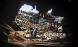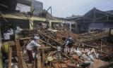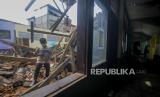 Pelajar menyelamatkan buku di ruangan kelas yang ambruk di SD Negeri Ciheuleut 1, Kota Bogor, Jawa Barat, Selasa (29/3/2022). Sebanyak dua ruangan kelas di sekolah tersebut hancur tertimpa material atap bangunan karena kondisi konstruksi rangka yang sudah keropos dan cuaca yang deras disertai angin kencang. Republika/Putra M. Akbar (FOTO : Republika/Putra M. Akbar)