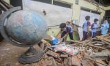 Pelajar menyelamatkan globe di ruangan kelas yang ambruk di SD Negeri Ciheuleut 1, Kota Bogor, Jawa Barat, Selasa (29/3/2022). Sebanyak dua ruangan kelas di sekolah tersebut hancur tertimpa material atap bangunan karena kondisi konstruksi rangka yang sudah keropos dan cuaca yang deras disertai angin kencang. Republika/Putra M. Akbar (FOTO : Republika/Putra M. Akbar)