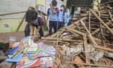 Pelajar menyelamatkan buku di ruangan kelas yang ambruk di SD Negeri Ciheuleut 1, Kota Bogor, Jawa Barat, Selasa (29/3/2022). Sebanyak dua ruangan kelas di sekolah tersebut hancur tertimpa material atap bangunan karena kondisi konstruksi rangka yang sudah keropos dan cuaca yang deras disertai angin kencang.  (FOTO : Republika/Putra M. Akbar)