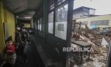 Pelajar berjalan melewati ruangan kelas yang ambruk di SD Negeri Ciheuleut 1, Kota Bogor, Jawa Barat, Selasa (29/3/2022). Sebanyak dua ruangan kelas di sekolah tersebut hancur tertimpa material atap bangunan karena kondisi konstruksi rangka yang sudah keropos dan cuaca yang deras disertai angin kencang. Republika/Putra M. Akbar (FOTO : Republika/Putra M. Akbar)
