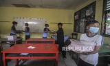 Pelajar menyelamatkan buku di kelas yang rawan ambruk di SD Negeri Ciheuleut 1, Kota Bogor, Jawa Barat, Selasa (29/3/2022). Sebanyak dua ruangan kelas di sekolah tersebut hancur tertimpa material atap bangunan karena kondisi konstruksi rangka yang sudah keropos dan cuaca yang deras disertai angin kencang.  (FOTO : Republika/Putra M. Akbar)