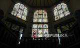 Hiasan kaca petri menjadi salah satu keunikan Museum Lawang Sewu, Semarang, Jawa Tengah, Rabu (30/3/2022). Museum Lawang Sewu merupakan destinasi favorit pengunjung untuk wisata sejarah. Landmark ikonik Semarang ini dibangun pada abad 19 oleh kolonial Belanda. Disukai wisatawan karena pesona unik bangunan tua dengan arsitektur zaman dulu, serta memiliki banyak pintu dan jendela. (FOTO : Wihdan Hidayat / Republika)