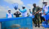 Wakil Menteri Pekerjaan Umum dan Perumahan Rakyat (PUPR) Jhon Wempi Wetipo (tengah) menjaring ikan saat memperingati puncak Hari Air Dunia (HAD) di Bendungan Randugunting, Japah, Blora, Jawa Tengah, Rabu (30/3/2022). Jhon Wempi Wetipo menanam bibit pohon dan menebar benih ikan pada peringatan Hari Air Dunia yang ke-30 dengan tema Melestarikan Air Tanah Agar Berkesinambungan tersebut. (FOTO : ANTARA/Yusuf Nugroho)