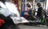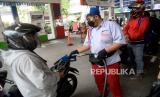 Seorang petugas membatu pembeli mengisi bahan bakar minyak (BBM) di stasiun pengisian bahan bakar umum (SPBU) di kawasan Kuningan, Jakarta, Rabu (30/3/2022). Komisi VI DPR RI mendukung penyesuaian harga BBM non subsidi mengikuti harga keekonomian minyak dunia untuk menjamin kesehatan keuangan Pertamina dalam menjalani penugasan pemerintah.Prayogi/Republika. (FOTO : Prayogi/Republika.)
