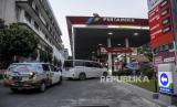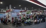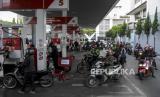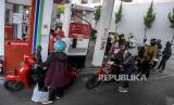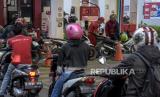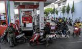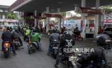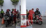 REPUBLIKA.CO.ID,BANDUNG -- Sejumlah pengendara sepeda motor antre untuk mengisi bahan bakar minyak (BBM) di SPBU Pertamina Riau, Jalan LLRE Martadinata, Kota Bandung, Rabu (30/3/2022).