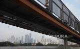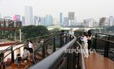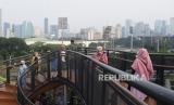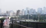 Warga menikmati pemandangan ibu kota dengan latar belakang gedung-gedung bertingkat yang diselimuti kabut di Skywalk Senayan Park, Jakarta, Rabu (30/3/2022). Badan Meteorologi, Klimatologi, dan Geofisika (BMKG) menjelaskan adanya fenomena langit di DKI Jakarta yang tampak berkabut merupakan akibat dari polusi seiring dengan peningkatan aktivitas kendaraan. (FOTO : ANTARA/Indrianto Eko Suwarso)