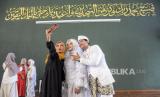 Pasangan pengantin melakukan sesi foto saat Nikah Massal di Masjid Al Ukhuwah, Jalan Wastukencana, Kota Bandung, Kamis (31/3/2022). Menjelang bulan suci Ramadhan 1443 H, DKM Masjid Al Ukhuwah bekerja sama dengan pihak swasta menggelar pernikahan massal bagi enam orang pasangan pengantin dengan membebaskan biaya nikah kepada setiap mempelai. Foto: Republika/Abdan Syakura (FOTO : REPUBLIKA/ABDAN SYAKURA)
