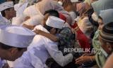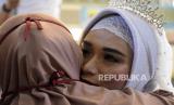 Pengantin menjalani prosesi sungkeman saat Nikah Massal di Masjid Al Ukhuwah, Jalan Wastukencana, Kota Bandung, Kamis (31/3/2022). Menjelang bulan suci Ramadhan 1443 H, DKM Masjid Al Ukhuwah bekerja sama dengan pihak swasta menggelar pernikahan massal bagi enam orang pasangan pengantin dengan membebaskan biaya nikah kepada setiap mempelai. Foto: Republika/Abdan Syakura (FOTO : REPUBLIKA/ABDAN SYAKURA)