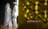 Sejumlah calon pengantin menunggu giliran untuk menjalani prosesi akad saat Nikah Massal di Masjid Al Ukhuwah, Jalan Wastukencana, Kota Bandung, Kamis (31/3/2022). Menjelang bulan suci Ramadhan 1443 H, DKM Masjid Al Ukhuwah bekerja sama dengan pihak swasta menggelar pernikahan massal bagi enam orang pasangan pengantin dengan membebaskan biaya nikah kepada setiap mempelai. Foto: Republika/Abdan Syakura (FOTO : REPUBLIKA/ABDAN SYAKURA)