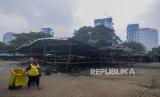 Petugas kebersihan berjalan di dekat puing-puing kios pasca kebakaran di kawasan Monas, Jakarta, Kamis (31/3/2022). Sebanyak 172 kios lenggang Jakarta terbakar yang diduga akibat korsleting listrik dengan kerugian diperkirakan mencapai Rp 1,2 miliar. (FOTO : Republika/Putra M. Akbar)