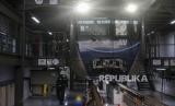 Petugas saat membersihkan lantai di tempat perawatan ringan di Depo MRT Lebak Bulus, Jakarta, Kamis (31/3/2022). Pemeliharaan dan perawatan menyeluruh kereta Ratangga MRT Jakarta meliputi pemeriksaan harian, bulanan dan pengecekan dan perawatan besar yang dilakukan selama 4 tahun sekali seperti overhaul atau turun mesin. Republika/Putra M. Akbar (FOTO : Republika/Putra M. Akbar)