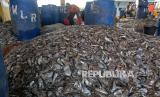 Pekerja menaburkan garam untuk mengawetkan ikan yang baru ditangkap di Tempat Pelelangan Ikan (TPI) Tawang, Rowosari, Kendal, Jateng, Kamis (31/3/2022). Menurut nelayan setempat, melimpahnya hasil tangkapan ikan sejak beberapa pekan melimpah dipengaruhi oleh cuaca di Laut Jawa. (FOTO : Antara/Anis Efizudin)