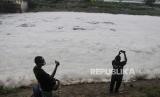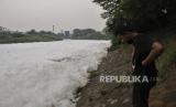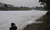 REPUBLIKA.CO.ID, BEKASI -- Jurnalis memotret aliran Kali Bekasi yang dipenuhi limbah busa, Jawa Barat, Jumat (1/4/2022).