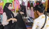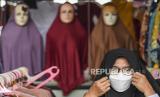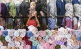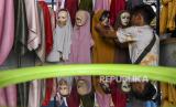 REPUBLIKA.CO.ID,JAKARTA -- Pembeli mencoba jilbab yang akan dibelinya di kawasan Jembatan Penyeberangan Multiguna atau Skybridge Tanah Abang, Jakarta, Jumat (1/4/2022).