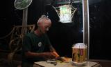 Seniman Pontianak Harry Eko Rifanto membuat lampion dari bungkusan mie instant di Kian Gallery Mustang di Gang Belibis, Pontianak, Kalimantan Barat, Jumat (1/4/2022) malam. Harry Eko Rifanto memanfaatkan limbah sampah plastik yang dikumpulkannya dari pedagang makanan dan dipungut dari jalan untuk dibuat menjadi karya seni seperti lampu hias, lampion, mainan, payung dan pernak-pernik lainnya. (FOTO : ANTARA/Jessica Helena Wuysang)