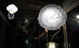 Seniman Pontianak Harry Eko Rifanto memperlihatkan hiasan lampu dan lampion dari limbah plastik buatannya di Kian Gallery Mustang di Gang Belibis, Pontianak, Kalimantan Barat, Jumat (1/4/2022) malam. Harry Eko Rifanto memanfaatkan limbah sampah plastik yang dikumpulkannya dari pedagang makanan dan dipungut dari jalan untuk dibuat menjadi karya seni seperti lampu hias, lampion, mainan, payung dan pernak-pernik lainnya. (FOTO : ANTARA/Jessica Helena Wuysang)