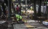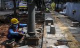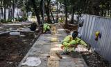 Pekerja menyelesaikan pembangunan trotoar di sekeliling Tebet Eco Park, Jakarta, Senin (4/4/2022). Pembangunan tersebut untuk memberikan kenyamanan pejalan kaki sebagai fasilitas penunjang bagi pengunjung Tebet Eco Park yang ditargetkan selesai dalam waktu satu pekan kedepan. Republika/Putra M. Akbar (FOTO : Republika/Putra M. Akbar)