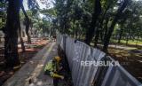 REPUBLIKA.CO.ID,JAKARTA -- Pekerja menyelesaikan pembangunan trotoar di sekeliling Tebet Eco Park, Jakarta, Senin (4/4/2022).