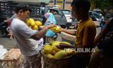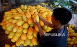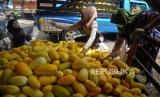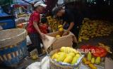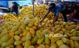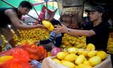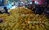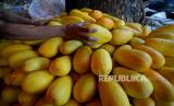 Pedagang menata buah timun suri di Pasar Induk Kramat Jati, Jakarta, Senin (4/4/2022). Menurut sejumlah pedagang setempat, permintaan buah musiman tersebut pada Ramadhan tahun ini belum mengalami peningkatan hal ini kemungkinan akibat masih menururnya daya beli masyarakat akibat covid-19. Timun suri yang merupakan sebagai salah satu santapan berbuka puasa ini dijual dengan harga Rp. 5000- Rp. 6000 per kg. (FOTO : Prayogi/Republika.)