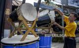 REPUBLIKA.CO.ID,BANDUNG -- Perajin menyelesaikan pembuatan beduk di kiosnya di Jalan Soekarno-Hatta, Batununggal, Kota Bandung, Senin (4/4/2022).
