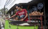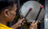 Perajin memukul beduk di kiosnya di Jalan Soekarno-Hatta, Batununggal, Kota Bandung, Senin (4/4/2022). Berdasarkan keterangan perajin di kawasan tersebut, penjualan beduk mengalami peningkatan 50 hingga 100 persen dibandingkan dengan bulan Ramadhan dua tahun terakhir yang terdampak Covid-19. Foto: Republika/Abdan Syakura (FOTO : REPUBLIKA/ABDAN SYAKURA)