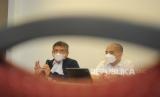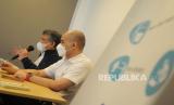 Anggota Badan Pengatur Jalan Tol (BPJT) Unsur Profesi dan Ketua Panitia Pelelangan Pengusahaan Jalan Tol Kamal-Teluknaga-Rajeg, Koentjahjo Pamboedi, Sekretaris Panitia Pelelangan Pengusahaan Jalan Tol Kamal-Teluknaga-Rajeg, Zamhur Rimaldi Karnadi (dari kiri) memberikan keterangan pada media terkait Progres Jalan Tol Kataraja (Kamal-Teluknaga-Rajeg) di The 101 Darmawangsa, Jakarta, (4/4/2022). Panitia Pelelangan Pengusahaan Jalan Tol Kamal-Teluknaga-Rajeg telah mengumumkan konsorsium yg lulus prakualifikasi untuk mengerjakan jalan tol tersebut. Jalan Tol Kamal-Teluknaga-Rajeg tersebut nantinya akan memiliki total panjang Jalan Tol sepanjang 38.6 KM. Adapun besarnya investasi untuk Jalan Tol Kamal-Teluknaga-Rajeg mencapai Rp18,7 triliun. Foto: Tahta Aidilla/Republika. (FOTO : Tahta Aidilla/Republika)