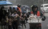 Sejumlah warga berteduh sebelum pembagian takjil gratis di kawasan Cempaka Putih, Jakarta, Selasa (5/4/2022). Sebanyak 200 paket takjil untuk berbuka puasa yang berasal dari donasi dari warga, organisasi dan instasi dibagikan secara gratis selama bulan Ramadhan tahun ini. (FOTO : Republika/Putra M. Akbar)