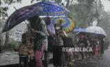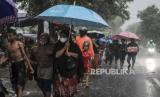 Antre Pembagian Takjil Gratis di Bawah Guyuran Hujan
