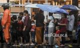 Sejumlah warga tiba untuk mengantre agar dapat mendapatkan takjil gratis di kawasan Cempaka Putih, Jakarta, Selasa (5/4/2022). Sebanyak 200 paket takjil untuk berbuka puasa yang berasal dari donasi dari warga, organisasi dan instasi dibagikan secara gratis selama bulan Ramadhan tahun ini. Republika/Putra M. Akbar (FOTO : Republika/Putra M. Akbar)