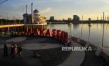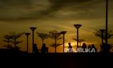 Warga menanti saat berbuka puasa (ngabuburit) di pelataran Masjid Terapung Amirul Mukminin, Anjungan Pantai Losari, Makassar, Sulawesi Selatan, Selasa (5/4/2022). Sebagian umat muslim di Makassar memilih menunggu saat berbuka puasa bersama keluarga dan kerabat di Anjungan Pantai Losari Makassar sambil menikmati matahari tenggelam (sunset). (FOTO : ANTARA/Abriawan Abhe/hp.)