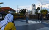 Warga berfoto sambil menunggu saat tiba berbuka puasa atau ngabuburit di sekitar patung merlion kawasan Sumber Wangi Kota Madiun, Jawa Timur, Selasa (5/4/202). Pada hari ketiga puasa Ramadhan, sebagian warga muslim Madiun ngabuburit di kawasan yang berada di tengah perkotaan tersebut. (FOTO : ANTARA/Siswowidodo/hp.)