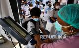 Petugas kesehatan memeriksa kondisi kesehatan anak saat acara Wisata Vaksin COVID-19 untuk siswa TK dan SD di kawasan Sumber Wangi Kota Madiun, Jawa Timur, Rabu (6/4/2022). Vaksinasi massal COVID-19 bagi siswa TK dan SD tersebut sebagai upaya percepatan vaksinasi dengan target pada perayaan Hari Raya Idu Fitri mendatang seluruh siswa TK dan SD di kota tersebut sudah mendapatkan vaksinasi lengkap sehingga ketika berkumpul dengan famili dari luar kota sudah memiliki kekebalan terhadap penularan COVID-19. (FOTO : Antara/Siswowidodo)