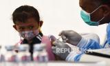 REPUBLIKA.CO.ID,MADIUN -- Petugas kesehatan menyuntikkan vaksin COVID-19 pada seorang anak saat acara Wisata Vaksin COVID-19 untuk siswa TK dan SD di kawasan Sumber Wangi Kota Madiun, Jawa Timur, Rabu (6/4/2022).