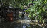 Warga melintasi genangan air akibat dari proyek pembangunan Waduk Cawang di Kampung Dalem, Cawang, Jakarta, Rabu (6/4/2022). Dampak dari pembangunan Waduk Cawang membuat pemukiman warga di RT 4 dan RT 5, Kampung Dalem, Cawang, yang lokasinya berada di dekat proyek terendam air karena tersumbatnya aliran saluran air.  (FOTO : Republika/Putra M. Akbar)